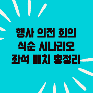 이처럼 행사 의전, 회의, 식순, 시나리오, 좌석 배치 등을 체계적으로 준비하면 성공적인 행사 진행이 가능합니다. 행사 준비 시 이러한 핵심 요소들을 꼼꼼히 점검하고 관련 규정과 관행을 숙지하는 것이 중요합니다.